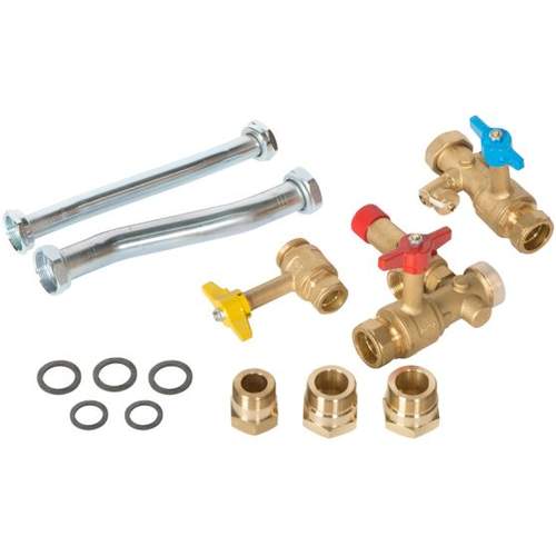 Ketelaansluitset met afsluiters, vul- en aftapkraan, terugslagklep en overstortventiel. In de set kan eventueel de pomp worden geplaatst.