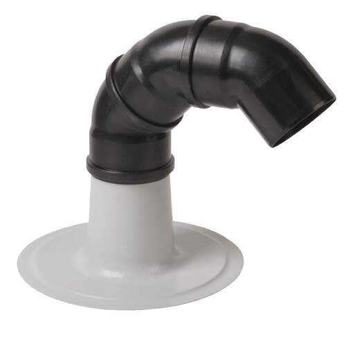 Deze dakdoorvoer is uitgevoerd met 3 stuks PP bochten van 45° (mof x spie, met lipring) en 1 aluminium plakplaat. Door de 3 bochten in elkaar te schuiven is inwateren door regen onmogelijk.