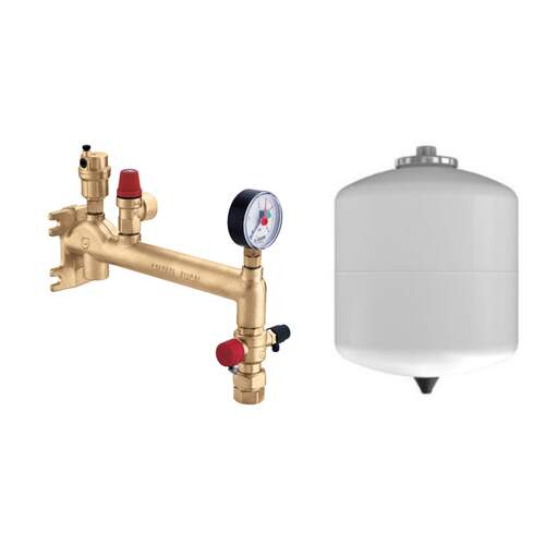 Hoogwaardige veiligheidsset, zowel bronzijdig als afgiftezijdig te gebruiken. De set is compleet non-ferro en voorzien van een hoogwaardig expansievat en een messing aansluitconsole met ontluchter, manometer en KAP ventiel.