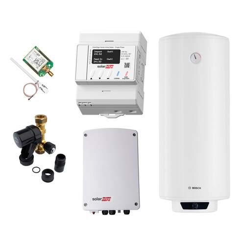 Met behulp van dit pakket maximaliseer je het eigen gebruik van opgewekte stroom uit pv-panelen door omzetting naar heet water. De stroomaanvoer (tot 3 kW) wordt aangepast op basis van beschikbare stroom uit de pv-panelen. Dankzij het Bosch Tronic 4000T elektrisch voorraadtoestel heb je voldoende warm water voor een of meerdere tappunten.