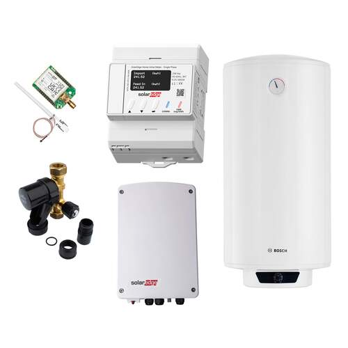 Met behulp van dit pakket maximaliseer je het eigen gebruik van opgewekte stroom uit pv-panelen door omzetting naar heet water. Dit warmwaterpakket omvat alle onderdelen om dat eenvoudig mogelijk te maken. De stroomaanvoer (tot 3 kW) wordt aangepast op basis van beschikbare stroom uit de pv-panelen. Dankzij het Bosch Tronic 2102T elektrisch voorraadtoestel heb je voldoende warm water voor een of meerdere tappunten.