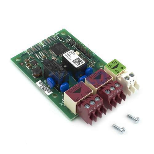 Uitbreidingsprint met twee vrij instelbare potentiaalvrije contacten voor statussignalering en 0-10 V uitgang voor sturing van een externe pomp. In te bouwen in het bedieningspaneel van de ketel of in de elektronica uitbreidingsbox S101.202.