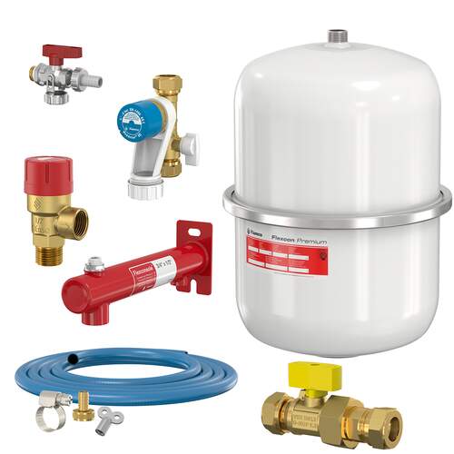 Dit Flamco Installatie Pakket bestaat uit:- Flexcon Premium 18/0,5 expansievat wit- Flexconsole wit- Prescor 1/2" veiligheidsventiel- Prescor inlaatcombinatie 15 mm knel- Simplex vul- en aftapkraan- Vulslangpakket- Gaskraan