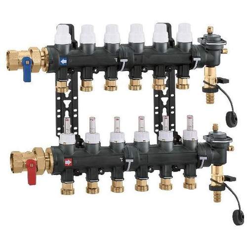 Caleffi 671 kunststof verdeler 6 x 3/4" buitendraad aftakking met debietmeters