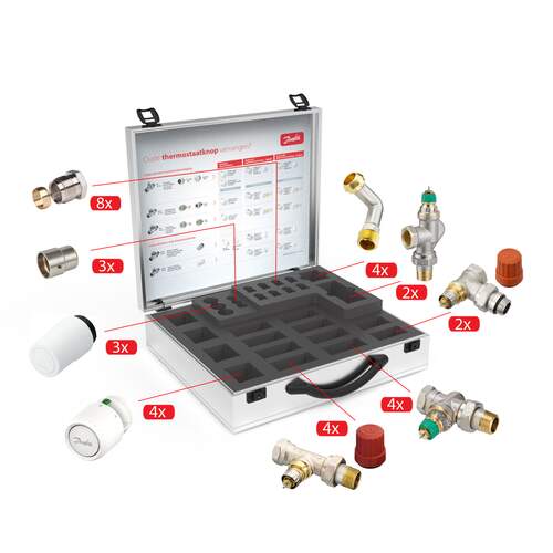 4x RA-Aveo standaard thermostaatknop (015G4090), 4x RA-N radiatorafsluiter 1/2" DN15 recht (013G0034), 2x RA-N radiatorafsluiter 1/2," DN15 haaks (013G0115), 4x RA-DV thermostatisch radiatorafsluiter 1/2" DN15 recht (013G7724), 2x RA-DV thermostatisch radiatorafsluiter 1/2" DN15 haaks verkeerd (013G7710), 3x RA5000 handknop (013G5002), 4x RA aansluitbocht 90° 1/2" (013G3100), 3x metalen afdekdop (192N3105), 8x knelfitting 1/2" x 15 mm, voor staal en koper (013G4115).