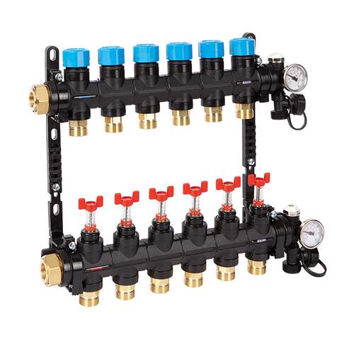 Deze Henco composiet vloerverwarmingsverdeler, regelbaar met debietmeting, is voorzien van thermische regelen, vul-aftapkraan en ontluchter, en is geschikt voor zowel woningbouw als utiliteitsbouw. De kunststof verdeler is compact van opbouw en heeft verstelbare beugels,wat een gemakkelijke installatie toelaat. Deze verdeler is uitgerust met debietmeters en een fijnregeling per groep. Uitgangen worden eurconus 3/4” aangesloten.