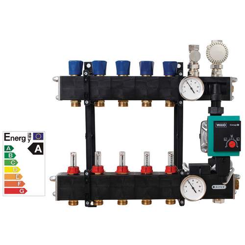 Composiet verdeler voor zowel woningbouw als utiliteitsbouw. Hij is solide van opbouw en laat een vlotte montage toe, zijn body heeft dubbele holle kamers waardoor hij goed isolerend is. Deze verdeler is uitgerust met debietregelaars per groep en heeft mogelijkheid grotere debieten te sturen bij minimaal drukverlies. Uitgangen worden euroconus 3/4” aangesloten.