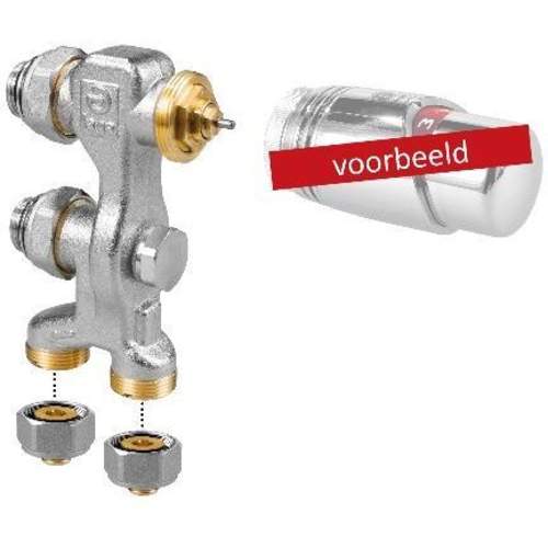 Low H2O Vloer aansluitset naar vloer eenpijps bediening via onderzijde met thermostaatknop wit en klemkoppelinggen 219