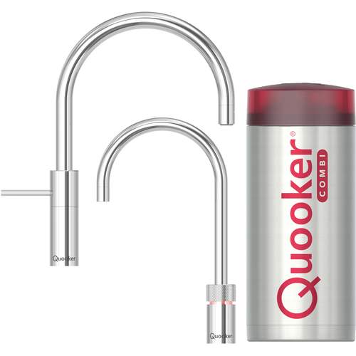 Quooker keukenboilercombinatie, inclusief Nordic Round, kokend-water-kraan met kindveilige (dubbel)druk-draai bedieningsknop en bijpassende mengkraan, Chroom.
