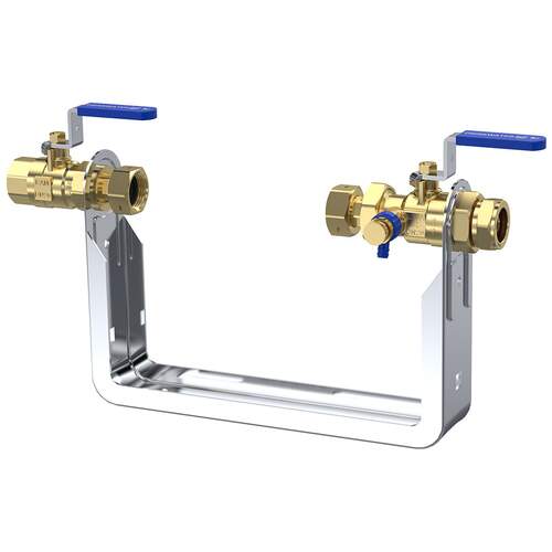 rvs watermeterbeugel met geïntegreerde kogelkranen en koppelingen, aftapper, bevestigingsmateriaal
