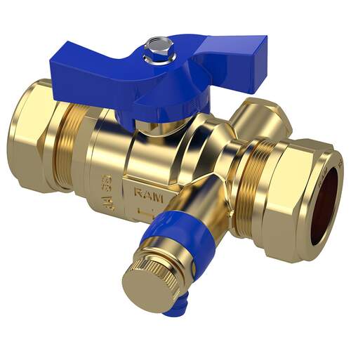 Raminex kogelkraan s.28, 22 x 22 mm, knel, DN20, PN10, met aftapgelegenheid, vlinderhendel, messing