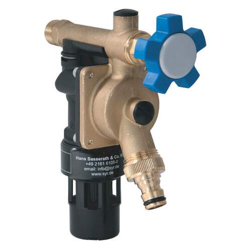 Raminex terugstroombeveiliging TBE-STBA type 400, 1/2" buitendraad x slangwartel, DN15, geïntegreerde spindelafsluiter, met filter en Easy Service cartridge