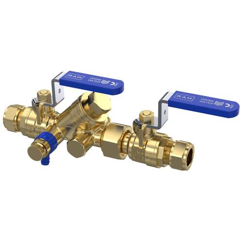 Raminex terugstroombeveiliging TBE-EA EASY SERVICE, 15 x 15 mm knel, DN15, PN10, met kogelafsluiter met aftapper en tweede kogelafsluiter benedenstrooms