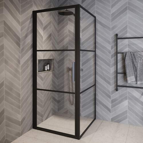 Riho Grid hoekcabine, draaideur 80 en zijwand 90 met zwart profiel helder glas