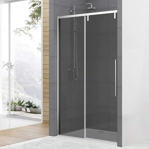 Van Rijn ST06 Softclose schuifdeur 1380-1390 x 2000 grijs rookglas 8 mm incl. glasbehandeling, chroom, en greep. Combineren met wand naar keuze.