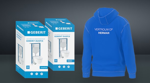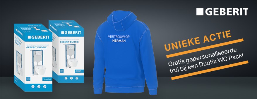 Alsof het allemaal nog niet mooi genoeg is, biedt Geberit nu nóg een reden om voor een Duofix wc-pack te kiezen. Bij elke aankoop vind je in het pack een unieke code waarmee je gratis een gepersonaliseerde trui kunt bestellen. Je kunt kiezen uit een sweater of een hoodie.