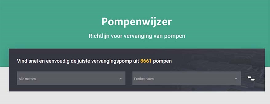 Een defecte pomp betekent werk. Er moet een nieuwe gevonden worden, de defecte pomp moet eruit en de nieuwe moet (passend) erin. Pompenwijzer helpt om op een snelle en eenvoudige manier de juiste nieuwe pomp te vinden. Indien van belang worden benodigde accessoires, zoals passtukken, getoond samen met handige opmerkingen waar je rekening mee moet houden bij de vervanging. In de database integreerden zij meer dan 8.000 pompen voor toepassingen als circulatie, drukverhoging, vuil- en afvalwater of bronwater. Een dynamische database die vrijwel dagelijks geactualiseerd wordt.