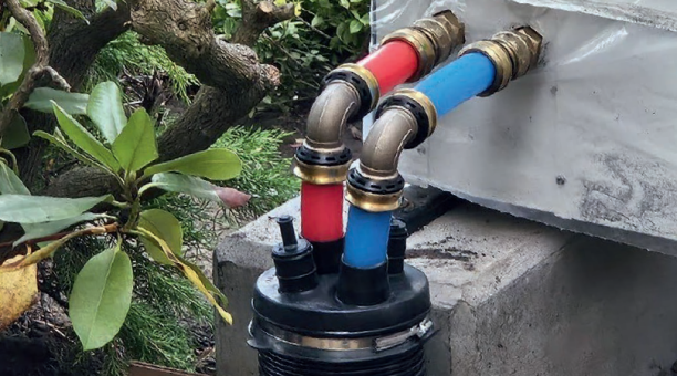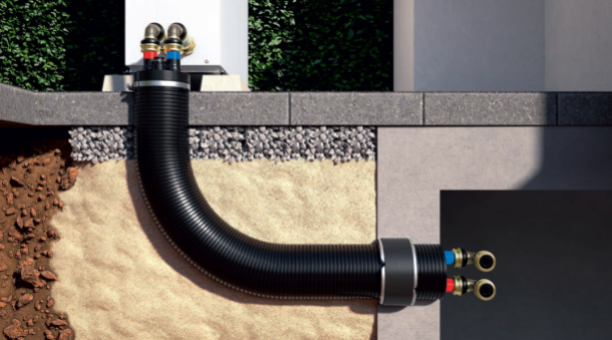 Voor ondergrondse aansluitingen biedt Viega een nieuw kunststof, geïsoleerd leidingsysteem dat wordt aangesloten met Raxofix-overgangsstukken. De aansluitleiding bestaat uit een robuuste mantelbuis met hoogwaardige schuimisolatie, waarin twee flexibele polybutyleen (PB) mediumleidingen én twee lege buizen voor elektrische bekabeling zijn geïntegreerd. De rode PB-buis (aanvoer) en blauwe PB-buis (retour) maken de aansluiting overzichtelijker en versnellen het werk, zowel bij de warmtepomp als bij de hydraulische componenten in het gebouw.
